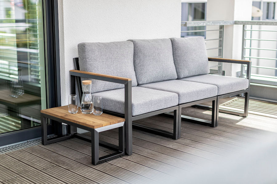 Das Loungemodul ist auf einem robusten Aluminiumrahmen konstruiert, der nicht nur eine hohe Stabilität gewährleistet, sondern auch leicht im Gewicht ist. Aluminium ist bekannt für seine Farbbeständigkeit, da es auch nach langer Verwendung im Freien seine Farbe behält. Außerdem ist das Material pflegeleicht: Schmutz und Flecken lassen sich einfach abwischen, ohne dass spezielle Reinigungsmittel erforderlich sind. Ein wichtiger Aspekt für den Einsatz im Freien ist die UV-Beständigkeit des Materials, die einen Schutz gegen Sonneneinstrahlung bietet und somit die Langlebigkeit des Produkts erhöht.