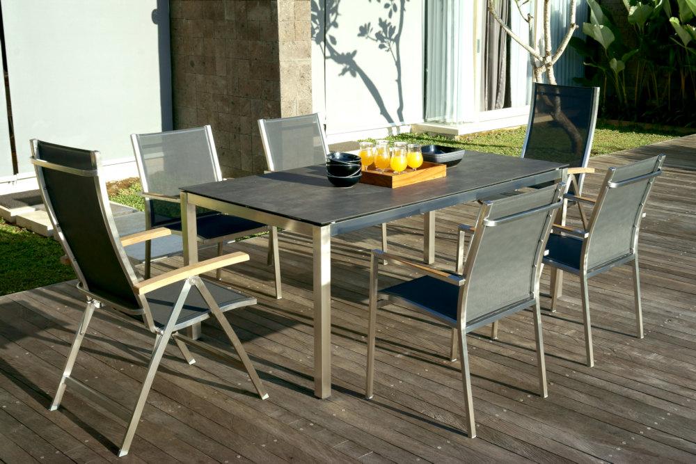 Dieser hochwertige Stapelsessel aus Edelstahl ist mit einer hautsympatischen Outdoor-Bespannung ausgestattet, dadurch verleiht uns der Sessel ein absolut angenehmes Sitzgefühl. Die Armlehnen werden aus Teak angeboten, damit ist sichergestellt, dass man auch an kühleren Abenden nicht friert. Der Sessel ist komplett stapelbar und ist somit leicht zu verstauen. Das Edelstahl ist gebrüstet, damit sind die gefürchteten Fingerflecken ausgeschlossen.