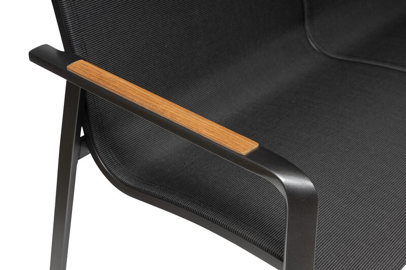 Das stabile Aluminiumgestell sorgt für ein geringes Eigengewicht von nur 6,5 kg bei gleichzeitig hoher Robustheit. Die Sitz- und Rückenflächen aus strapazierfähigem Outdoorgewebe bieten angenehmen Komfort und sind optimal für den Einsatz im Freien geeignet. Besonders edel wirken die Armlehnen aus FSC®-zertifiziertem Teakholz (FSC 100 %), die natürliche Wärme und Nachhaltigkeit ausstrahlen.