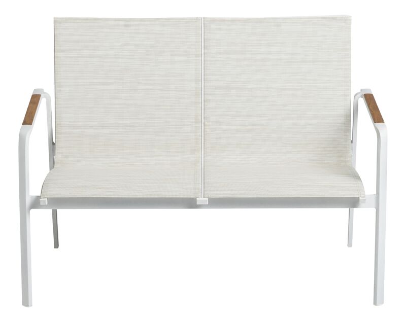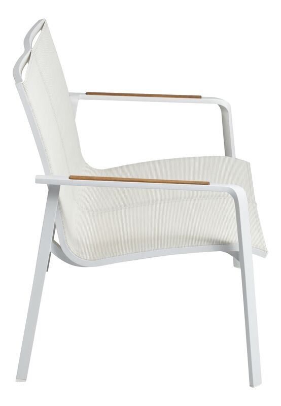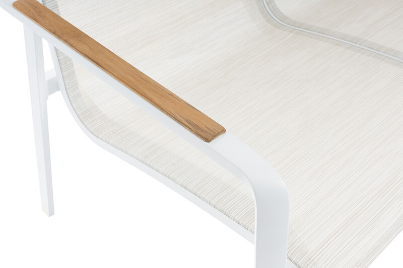 Das pulverbeschichtete Aluminiumgestell in Weiß matt überzeugt durch Stabilität, Wetterbeständigkeit und ein angenehm geringes Gewicht. Die Sitz- und Rückenflächen aus strapazierfähigem Outdoorgewebe in Beige sind pflegeleicht, schnelltrocknend und bieten einen komfortablen Sitzgenuss. Für einen natürlichen Akzent sorgen die Armlehnen aus FSC®-zertifiziertem Teakholz (FSC 100%), die dem klaren Design eine warme, hochwertige Note verleihen.